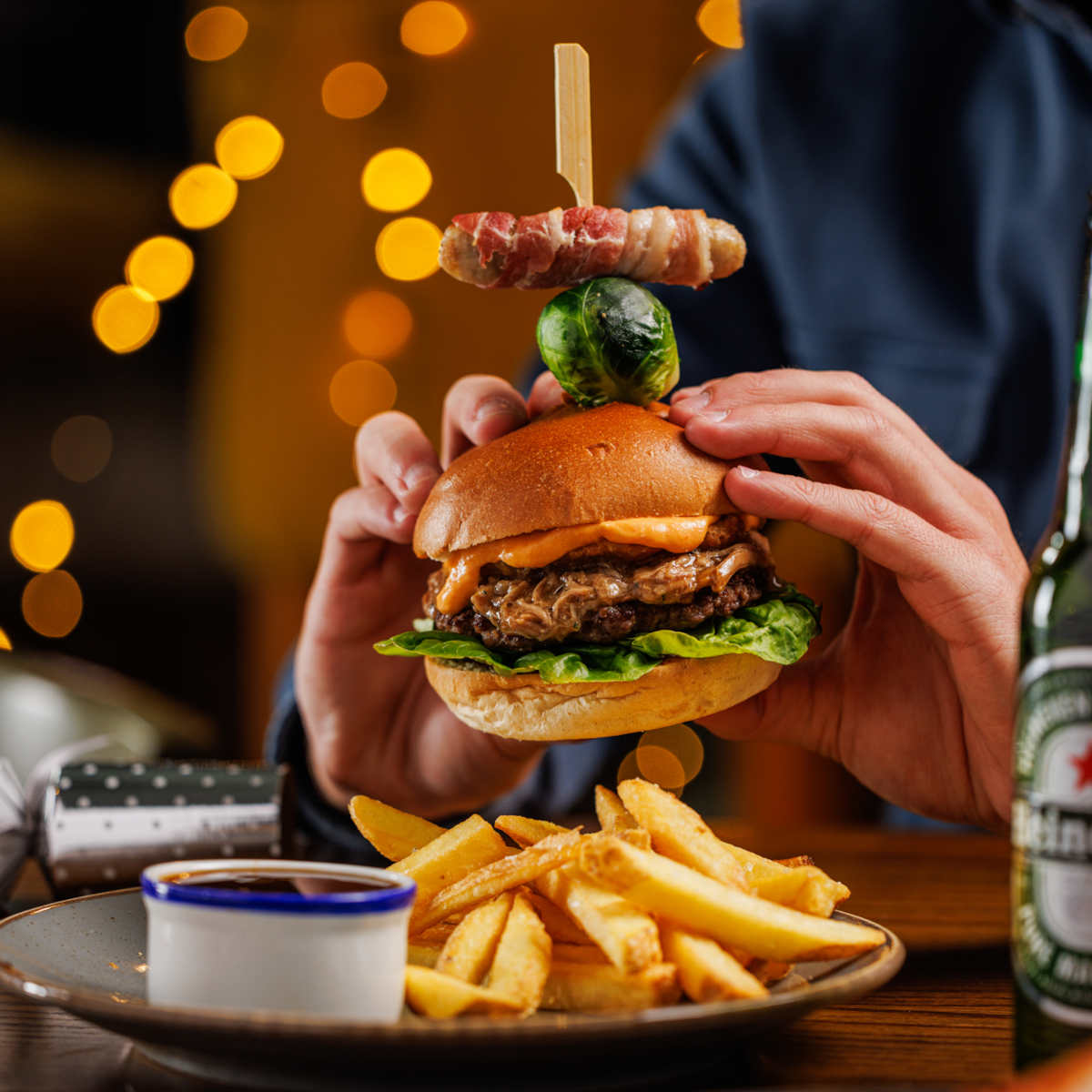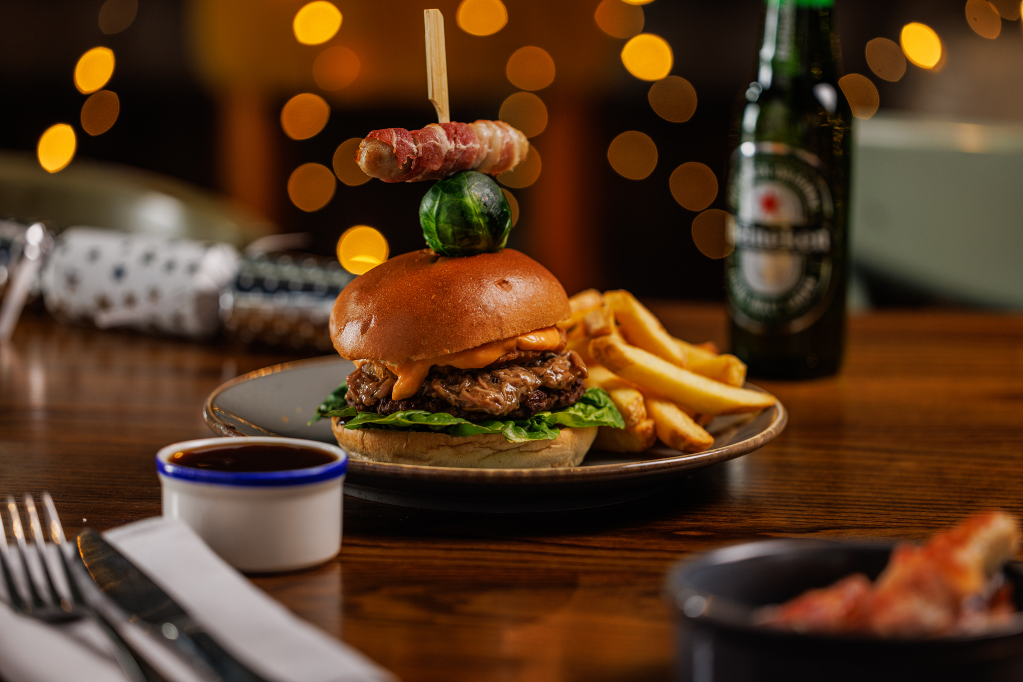 The festive stack burger, 3oz beef patty, BBQ pulled turkey, crispy onion rings, nacho cheese sauce and topped with a pig in blanket. Served with skin-on chips and beef dripping gravy