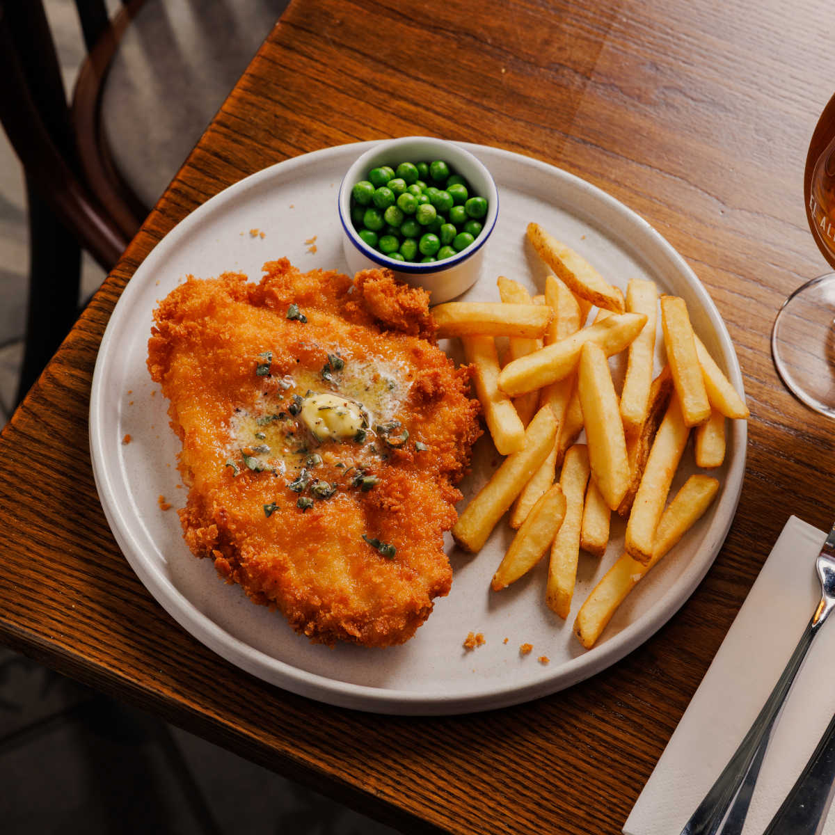 Crispy chicken schnitzel, breaded chicken topped with garlic butter, with chips and garden peas | 13.49 1364 kcals